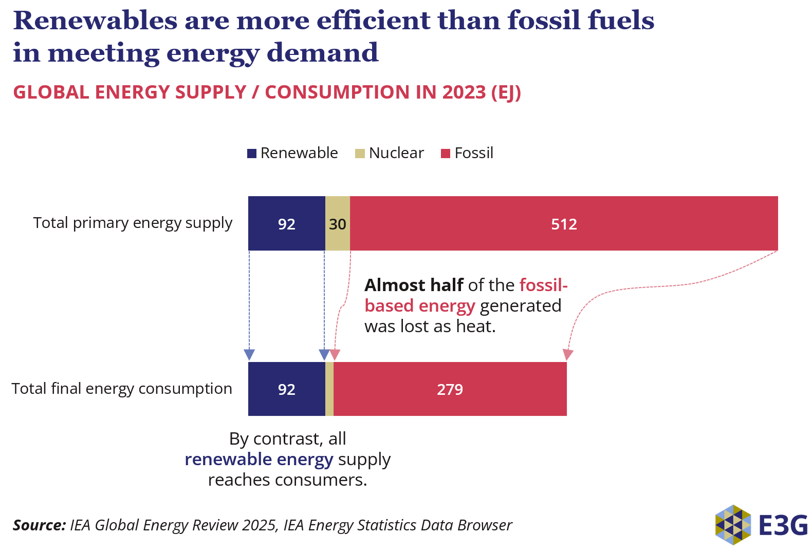A technical accounting quirk has long obscured the scale of the energy transition: fossil fuels still dominate energy supply on paper, but actually 40-70% never reaches the consumer and is lost as heat. There are no such losses with renewable electricity.
