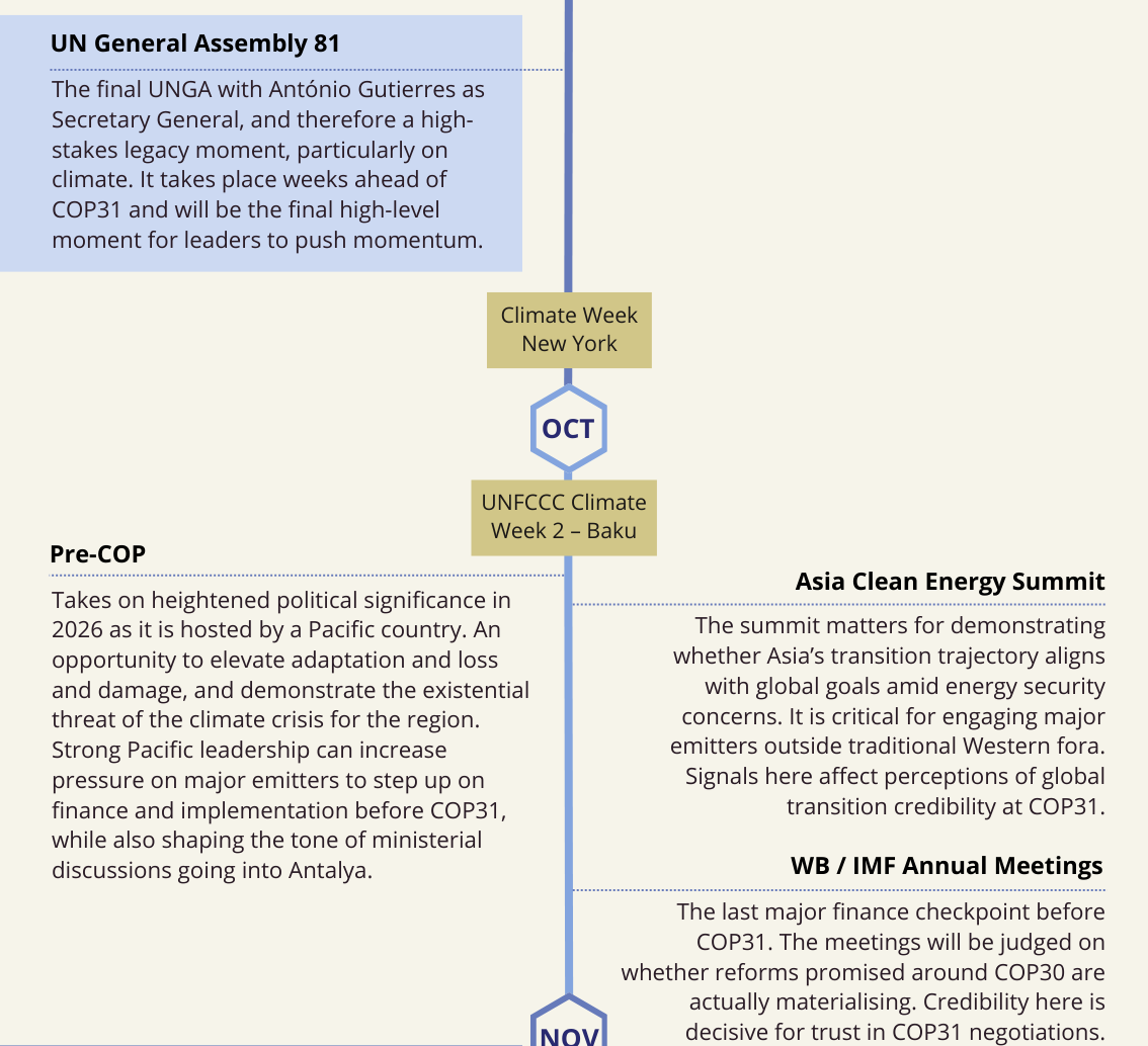 Parties must maintain a focus on translating political signals from inside and outside the process into implementation, leveraging the Action Agenda alongside new or reinvigorated coalitions and partnerships. In the lead-up to this year’s COP, it will be vital to sustain a steady drumbeat of climate leadership and delivery through a broader global calendar of key meetings and events. Our timeline visual below highlights some of the significant moments.