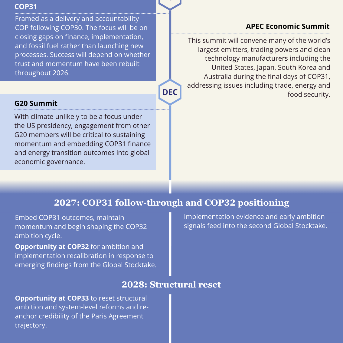 In a similar vein to COP30, success at COP31 will not be defined by a single flagship outcome, but rather how it delivers across a range of priorities. It will also depend on how it functions as part of a continuous political and technical process to 2028.