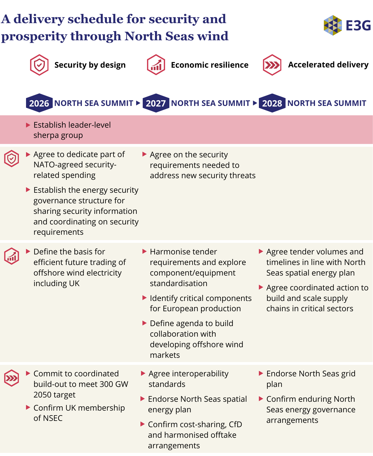 - Accelerate delivery. Commit to coordinated build-out to meet the 300 GW by 2050 target through a North Seas spatial energy plan to be approved at the next summit in 2027.